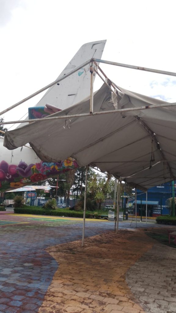 A un lado hay una carpa de toldo blanco, también dañado. Este lugar cuenta con un monumento a Francisco Villa, cuya base estaba llena de bidones de agua y detergentes.
