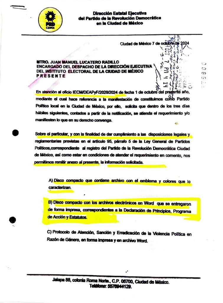 Antes, de acuerdo con oficios obtenidos por este reportero, Nora Arias entregó en disco compacto y de forma impresa los documentos básicos del PRD Ciudad de México: Declaración de Principios, Programa de Acción y Estatutos, condicionante para obtener el registro.