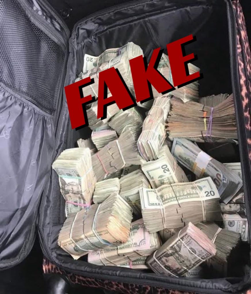 Una ‘volada’, diríamos en español; ‘fake’, en inglés, aunque con un daño de más de 400 mil vistas. La primera aberración es que se necesitan 50 mil billetes de 20 dólares para juntar un millón, y no caben en esa maletita. Además, resulta que esa imagen la encontramos en un canal de Youtube al cual la subieron en enero pasado, y en una página de Linkedin, a la que se agregó el año pasado.