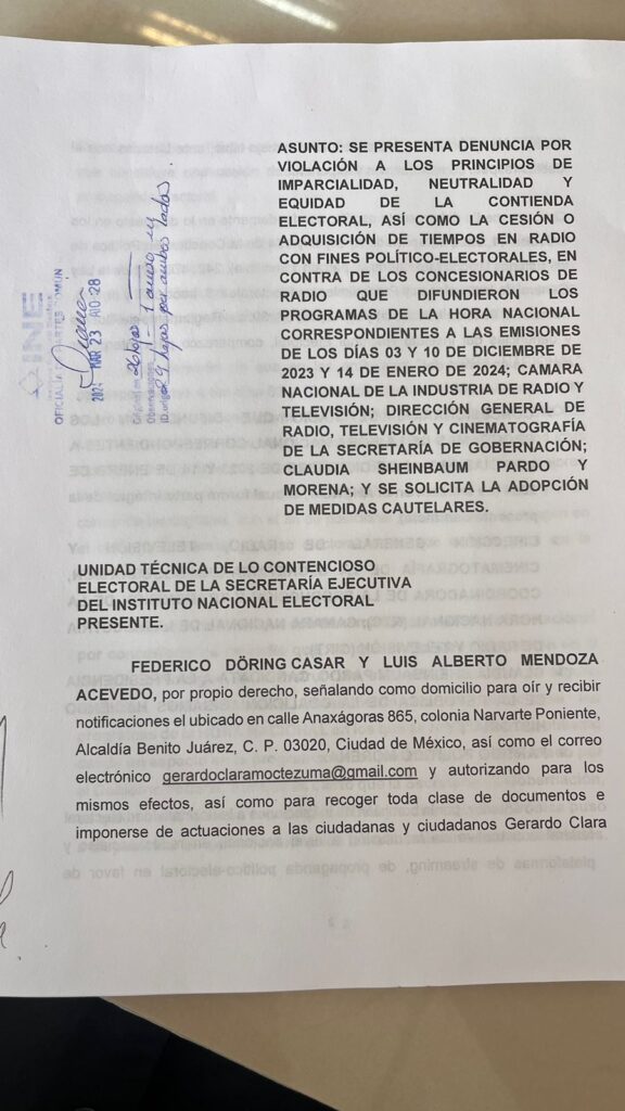 CIUDAD DE MÉXICO,24 de marzo, (CDMX MAGACÍN).-Luis Mendoza y Federico Döring presentaron una denuncia ante el INE en contra de concesionarios de radio por violar al principio de imparcialidad al ceder sus espacios o venderlos para la difusión de diversos programas de La Hora Nacional, producido con recursos públicos, en los que se benefició a la candidata de Morena a la presidencia de la República, Claudia Sheinbaum.