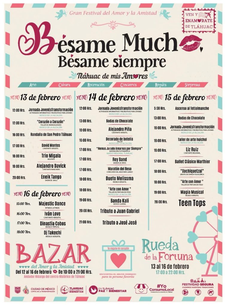 El Gran Festival del Amor y la Amistad «Bésame mucho. Bésame siempre», se llevará a cabo en Tláhuac de mis Amores a partir de mañana jueves 13 y hasta el próximo 16 de febrero, con motivo del Día de San Valentín.